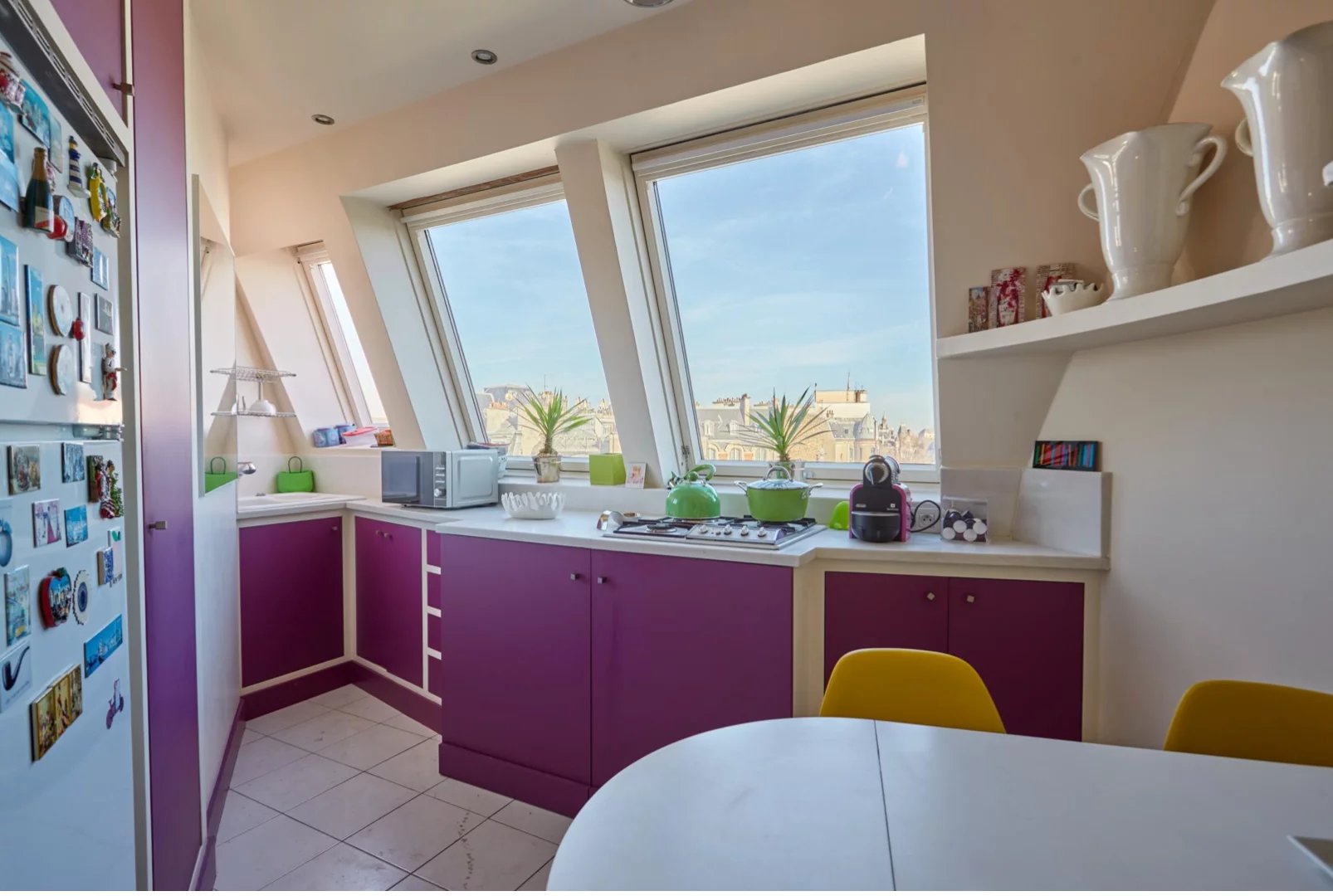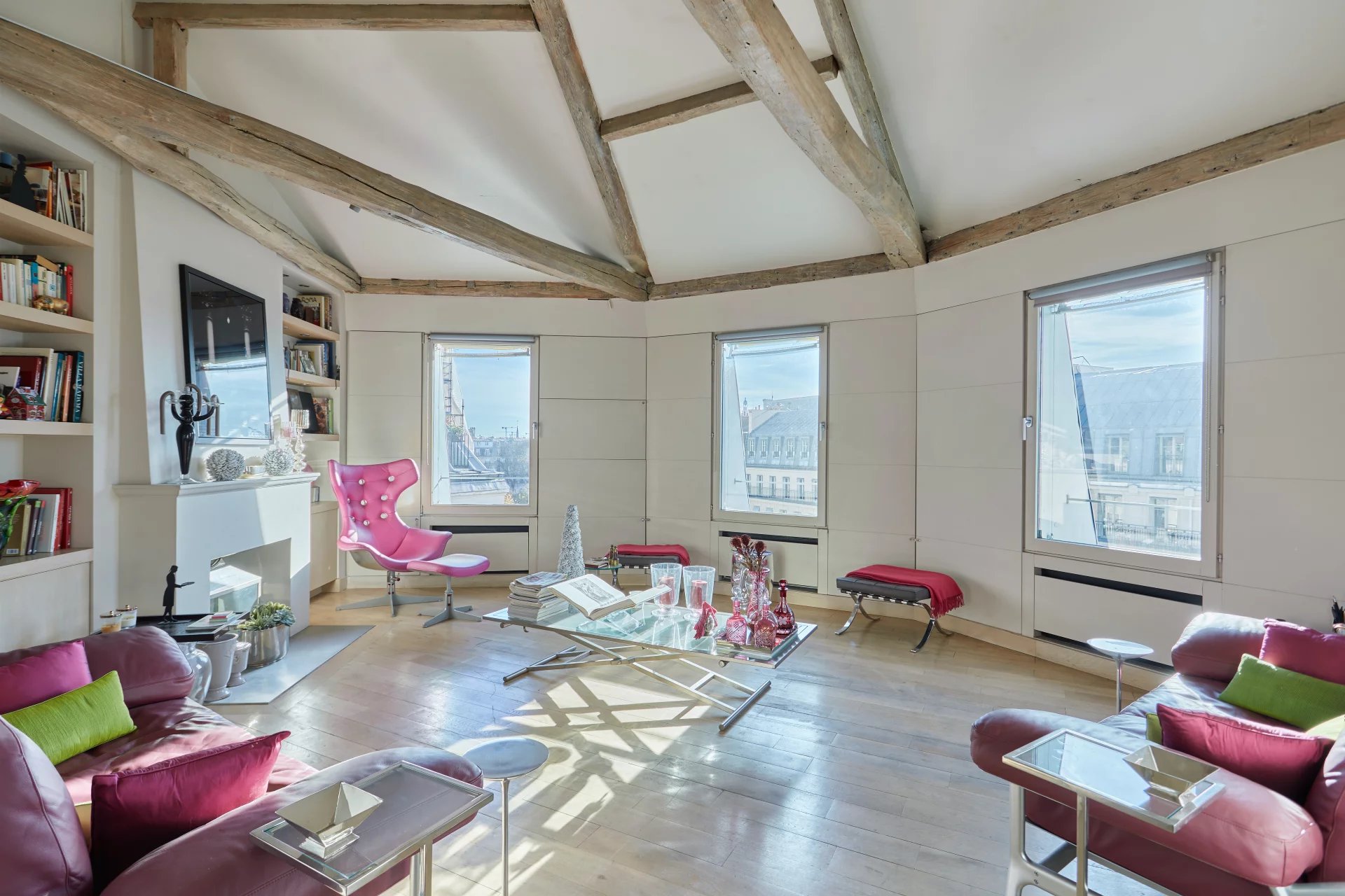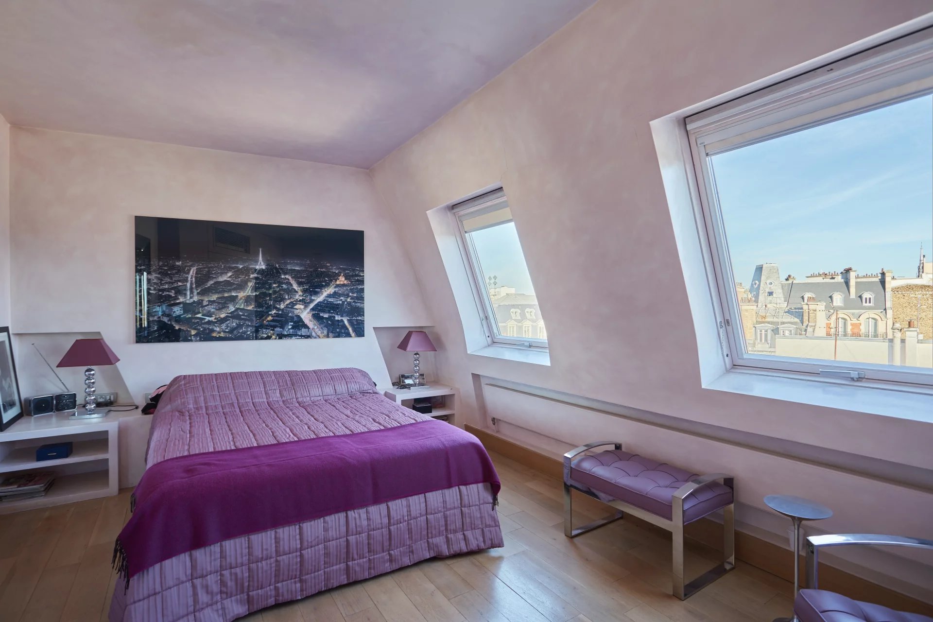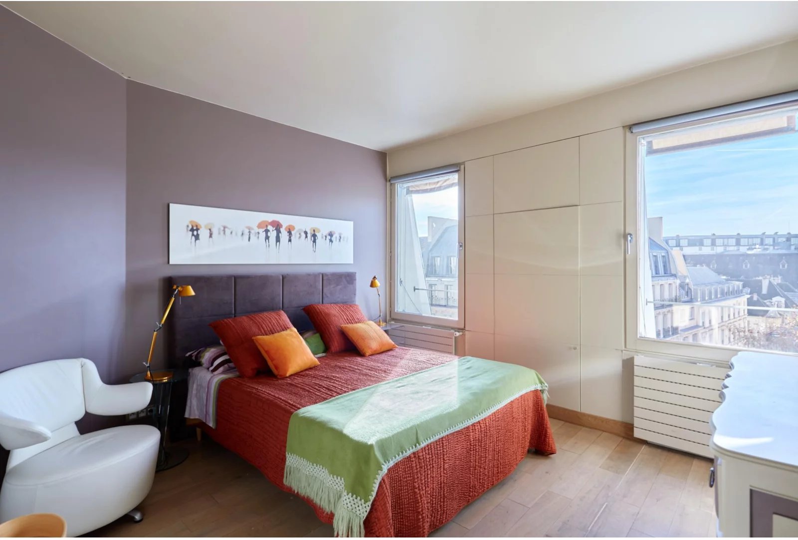 Dans un élégant immeuble Haussmannien, au 6ème et dernier étage par l'ascenseur, appartement aux vues spectaculaires de 3 pièces principales d'une surface de 88 m2 au sol et 82 m2 loi Carrez offrant des vues panoramiques, imprenables sur Paris et ses monuments.