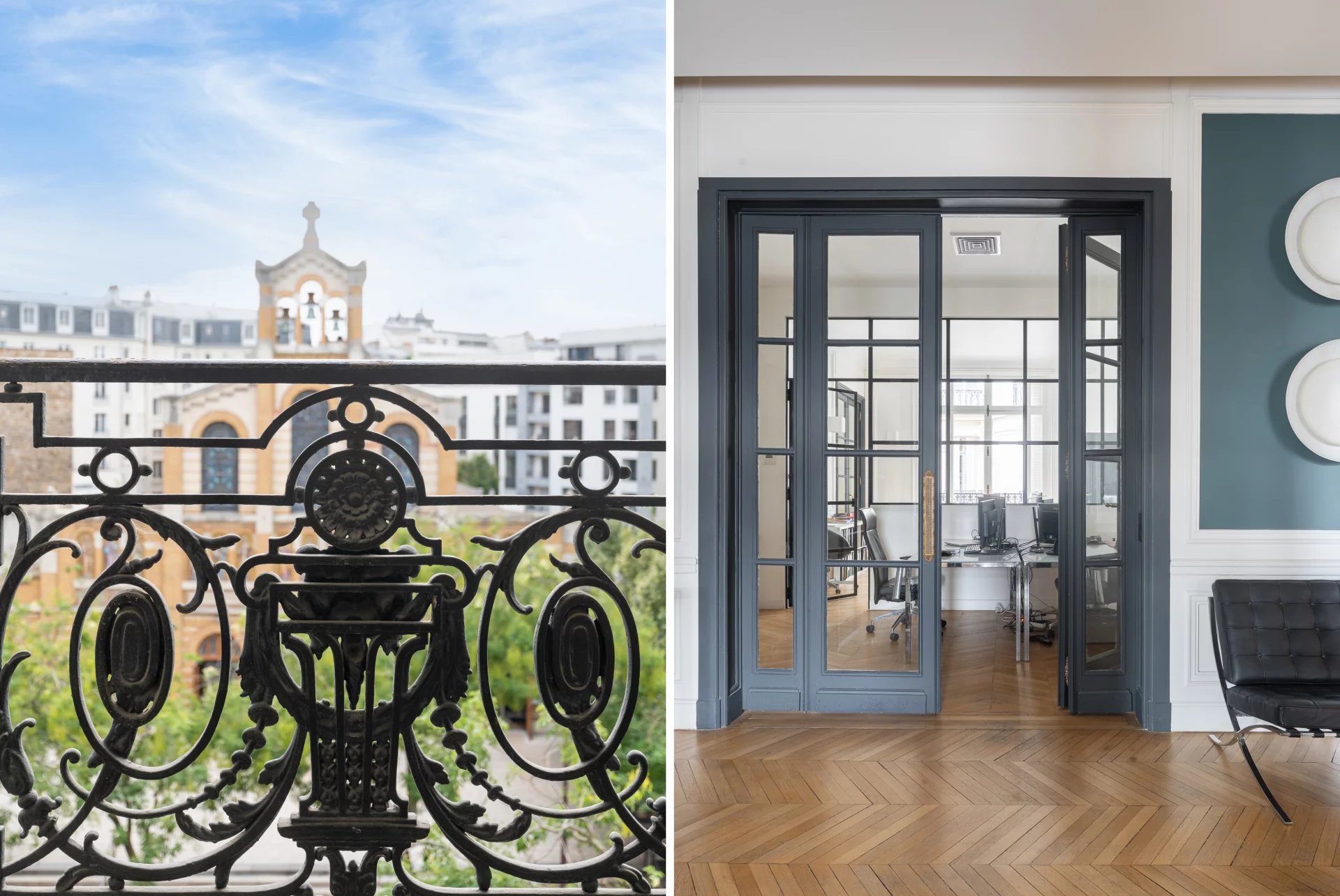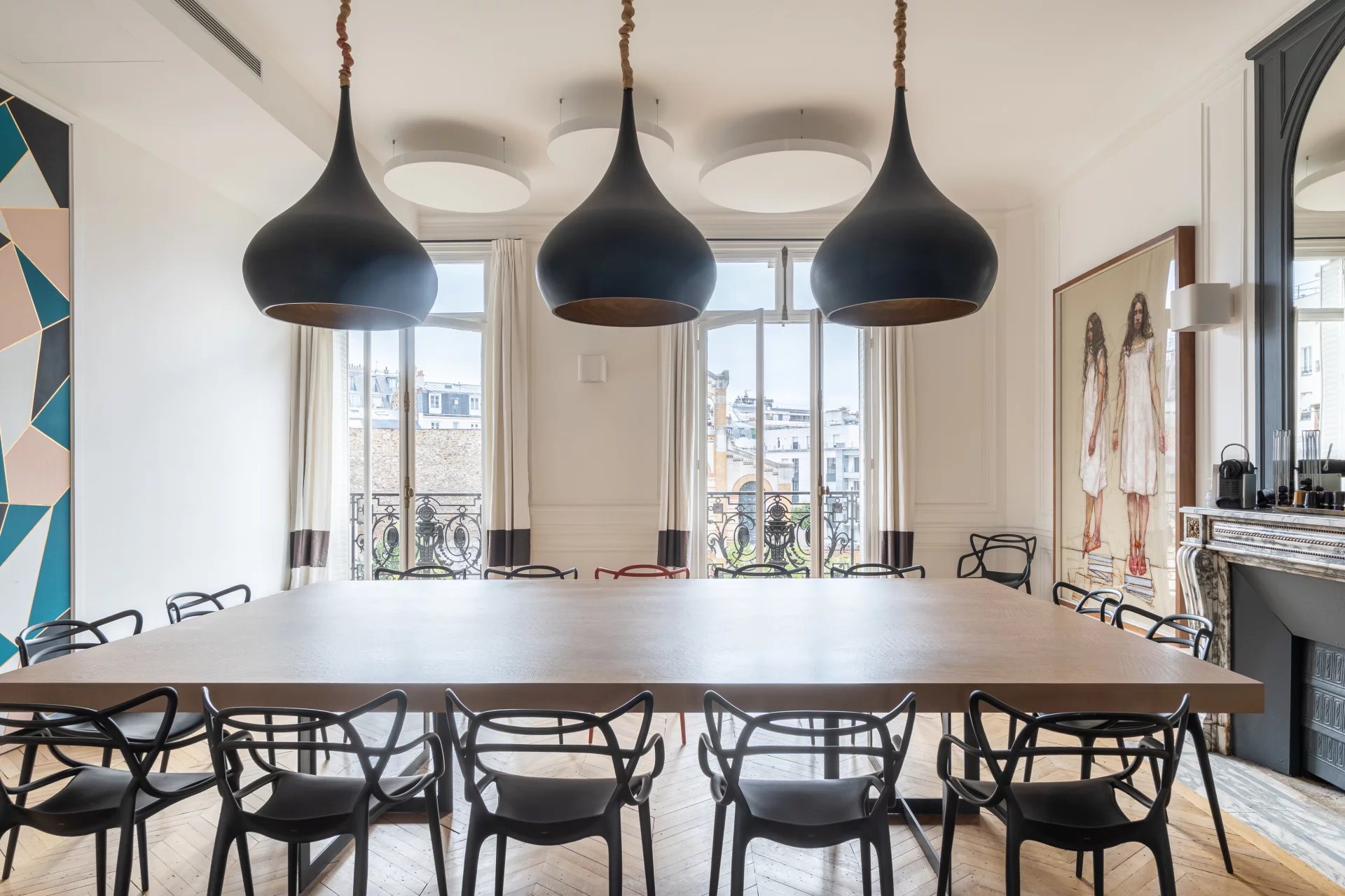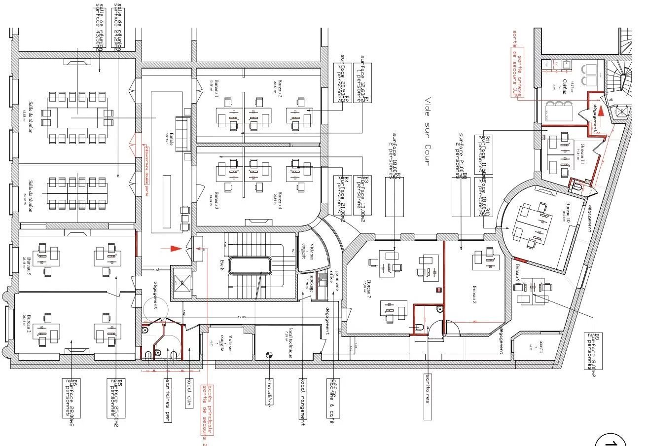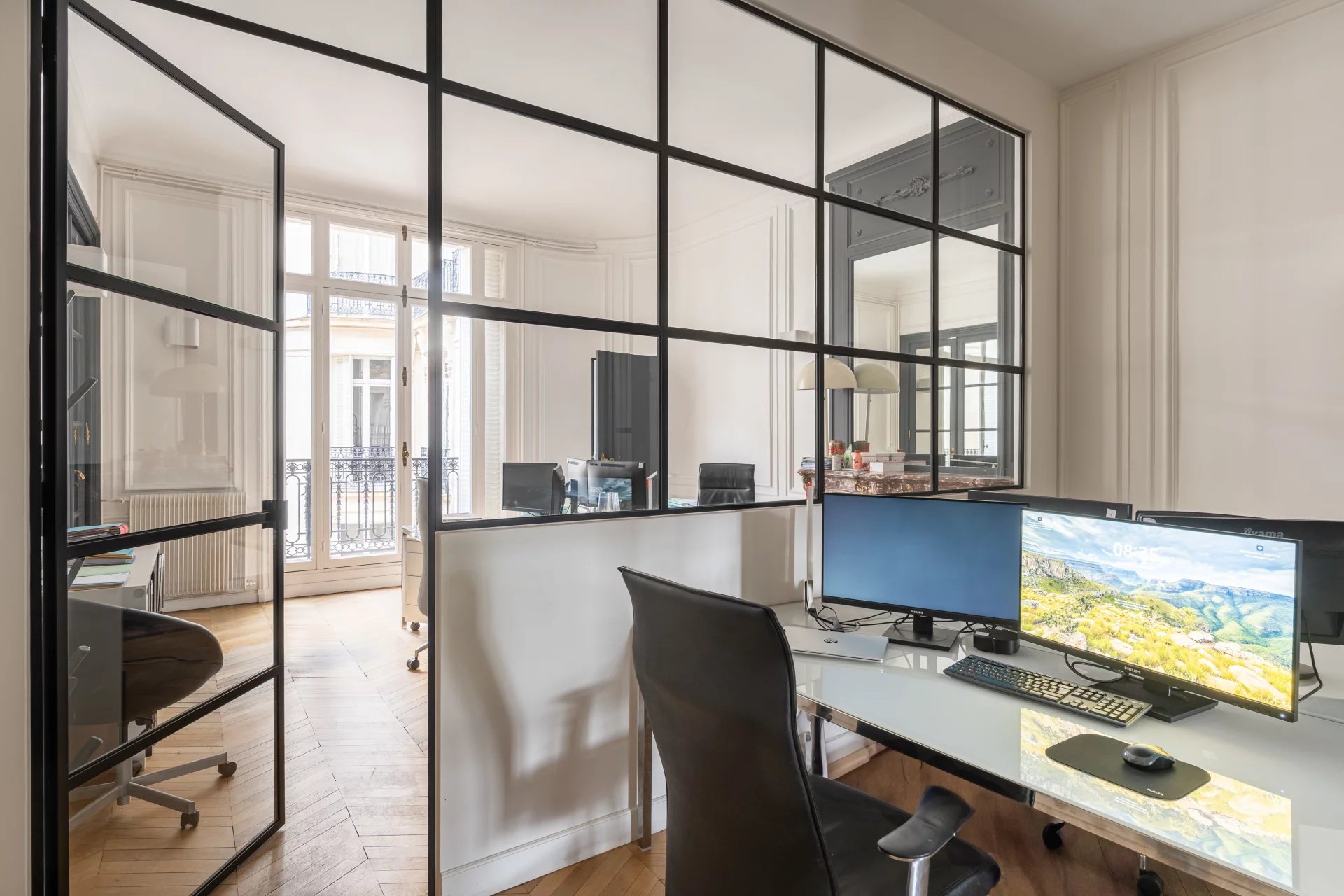 Actuellement configuré en espaces de travail modulables, il comprend une douzaine de bureaux, deux salles de réunion, une cuisine, et offre une grande flexibilité d’aménagement.